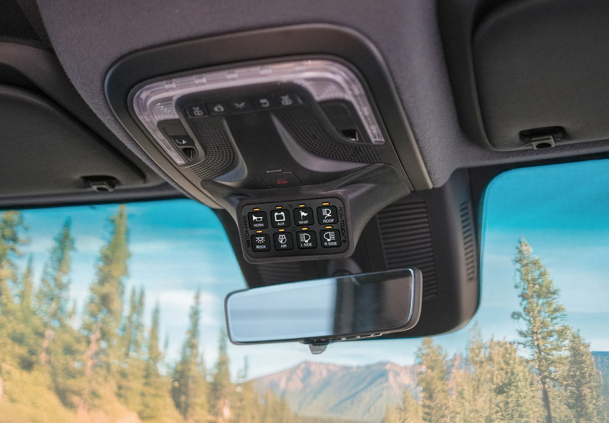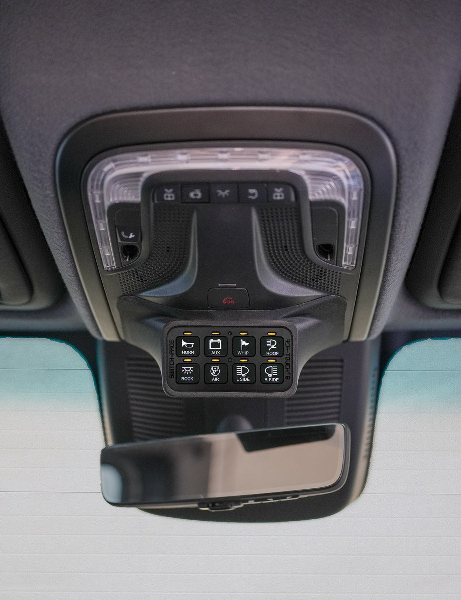This upper console switch mount replaces the factory sunglasses holder and provides a clean, OEM-style solution for installing the Switch-Pros SP9100 8-button panel in 2019+ Mercedes-Benz Sprinter (VS30) vans.